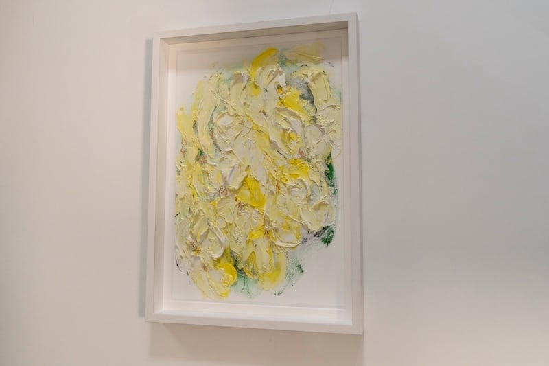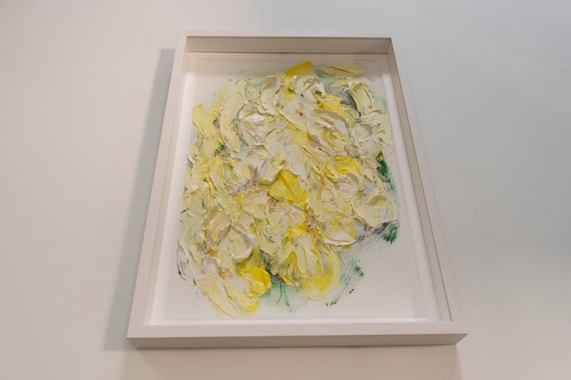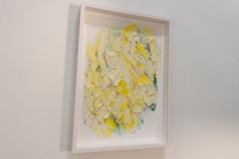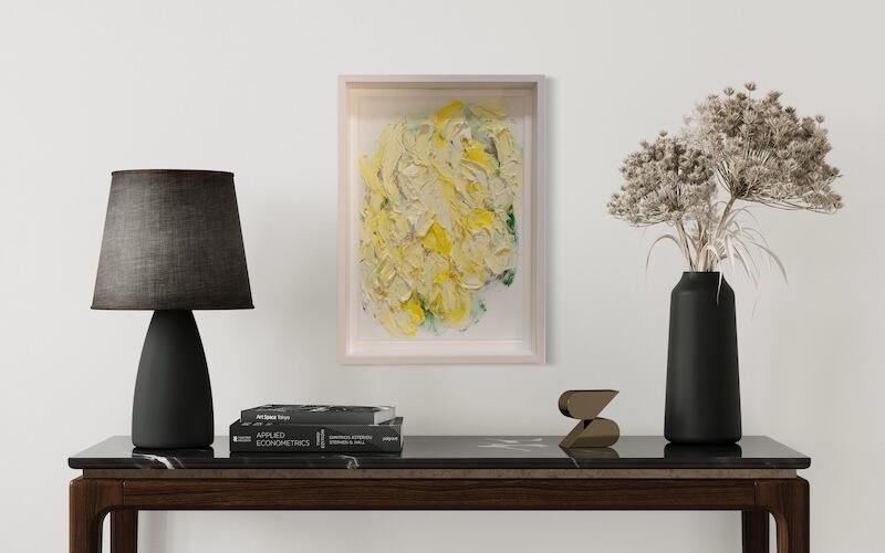作品を引き立てる白い木製ボックスフレームに額装した状態でお届けします。