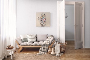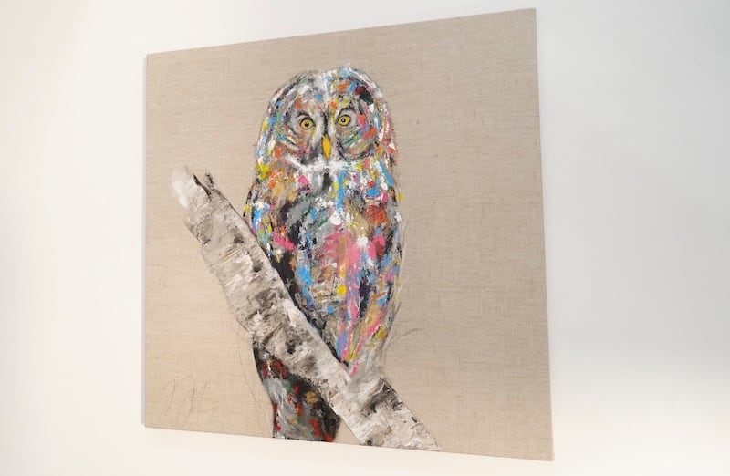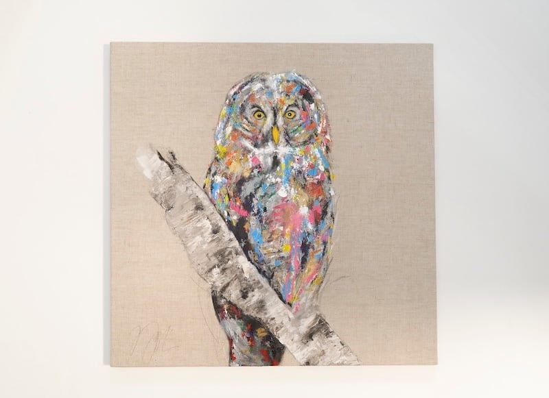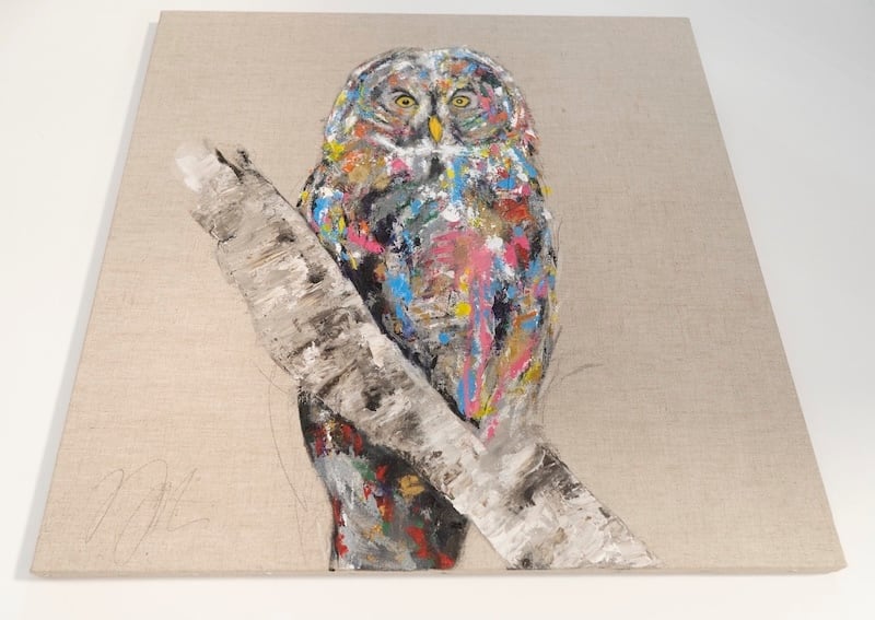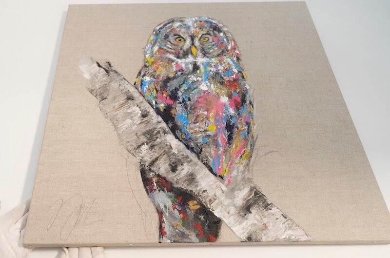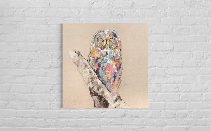 動物シリーズからフクロウのスプレーアート作品!知性や幸運の象徴でもあるフクロウを正方形キャンバスに表現した作品。キャンバスの質感をお洒落な感じに残し沢山の色を使って表現されたフクロウがかっこよくもあり、可愛らしい作品になっています。フクロウ好きには大変おすすめで、贈り物の絵としてもおすすめです。