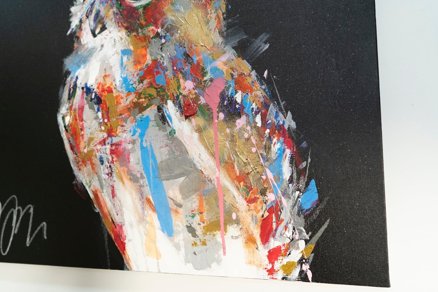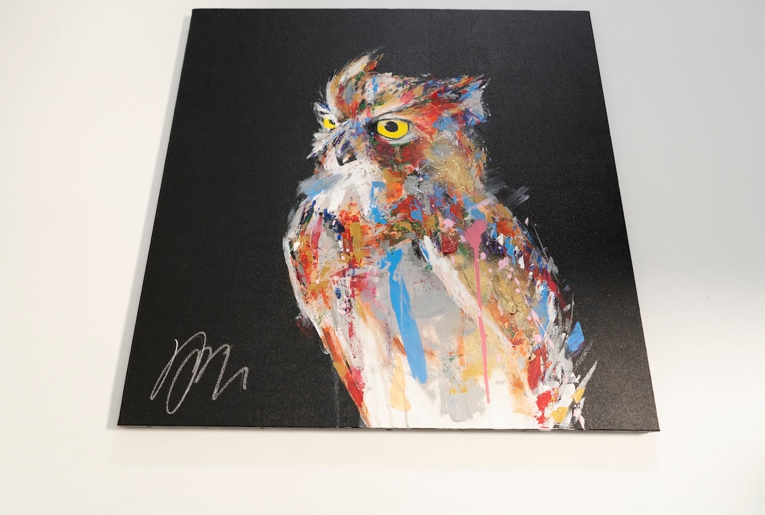 動物シリーズからフクロウのスプレーアート作品!知性や幸運の象徴でもあるフクロウを正方形キャンバスに表現した作品。沢山の色を使って表現されたフクロウがかっこよくもあり、可愛らしい作品になっています。フクロウ好きには大変おすすめで、贈り物の絵としてもおすすめです。
