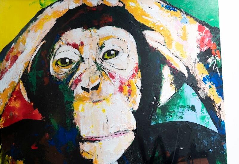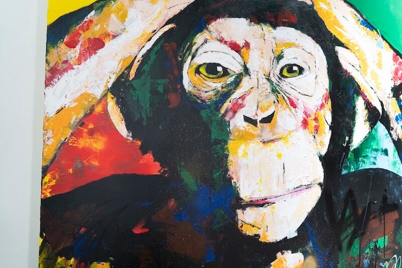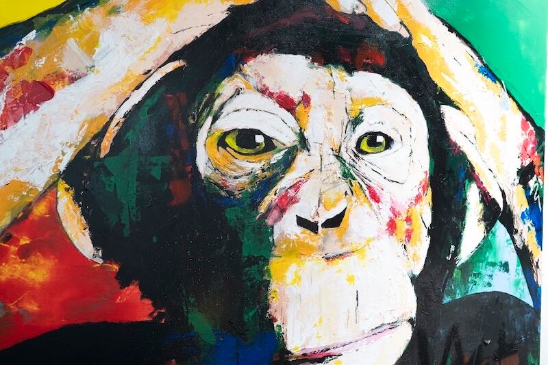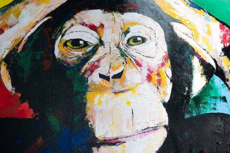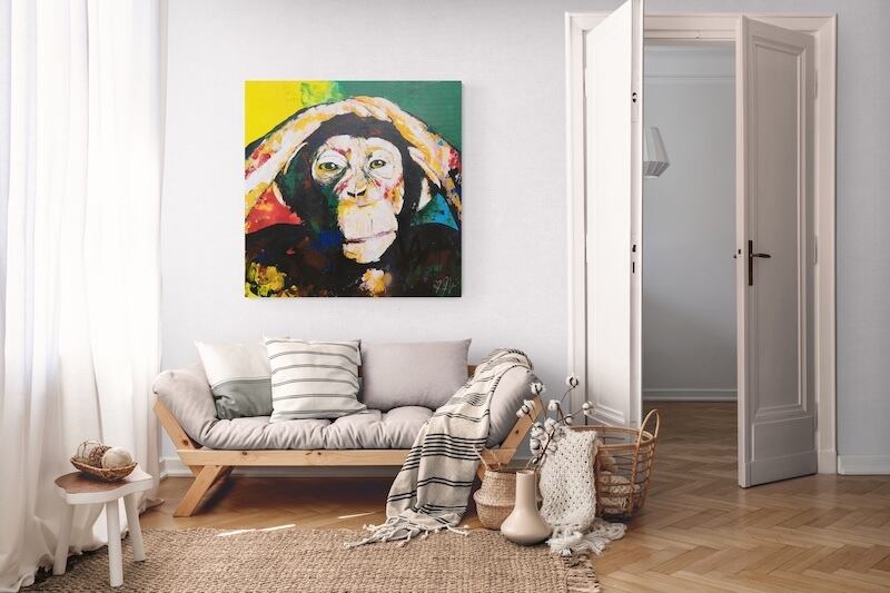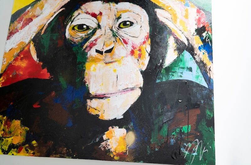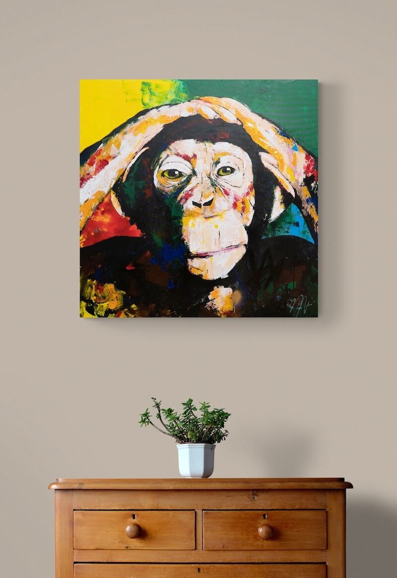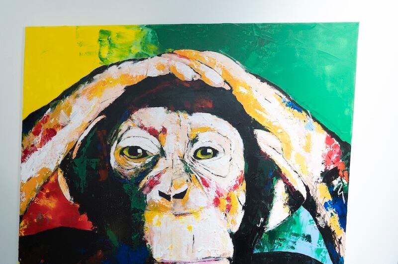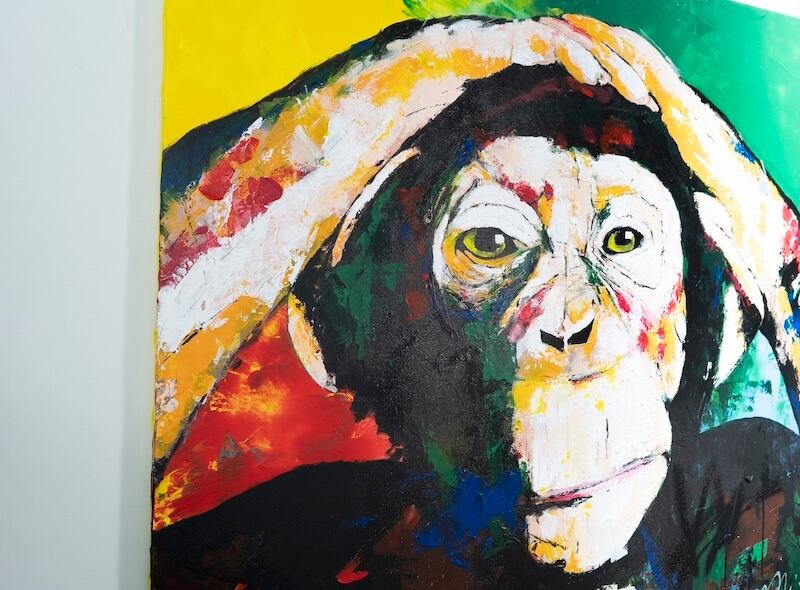 動物シリーズの作品の1点で、猿の可愛らしさと共に存在感や力強さを感じる作品。大きな正方形キャンバスに描かれていて迫力があります。
