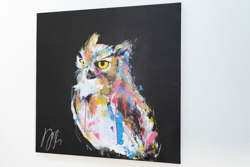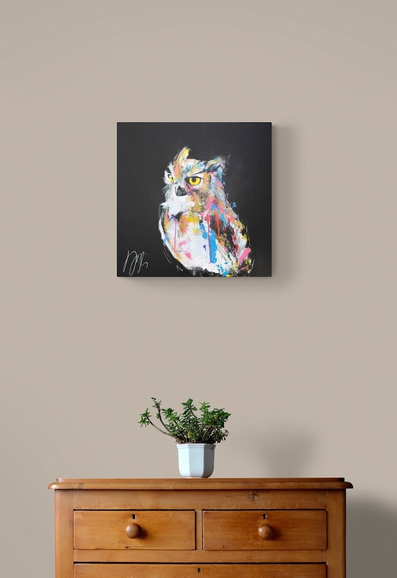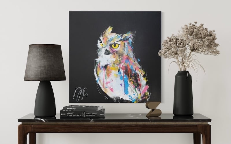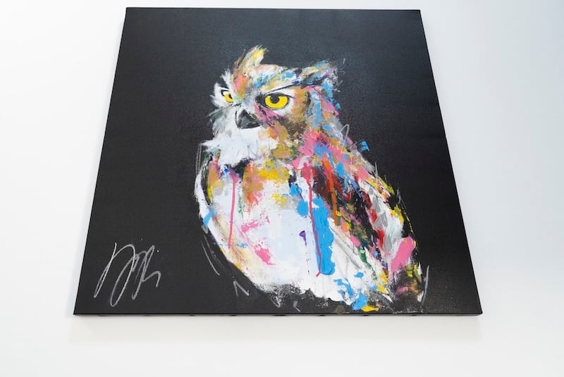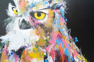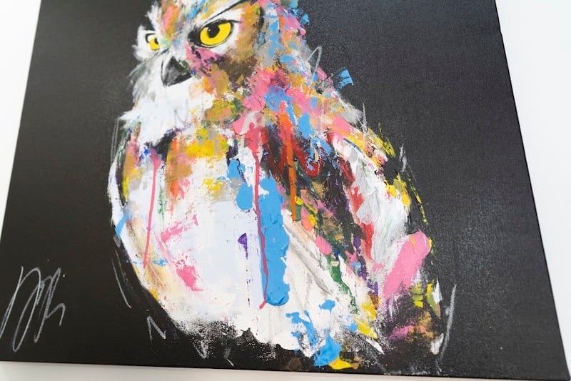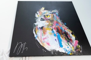 動物シリーズからフクロウのスプレーアート作品!知性や幸運の象徴でもあるフクロウを正方形キャンバスに表現した作品。沢山の色を使って表現されたフクロウがかっこよくもあり、可愛らしい作品になっています。フクロウ好きには大変おすすめで、贈り物の絵としてもおすすめです。