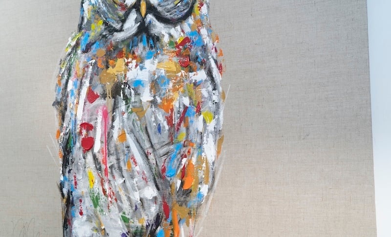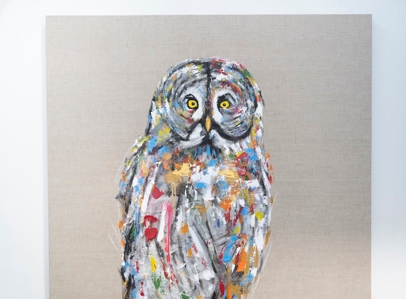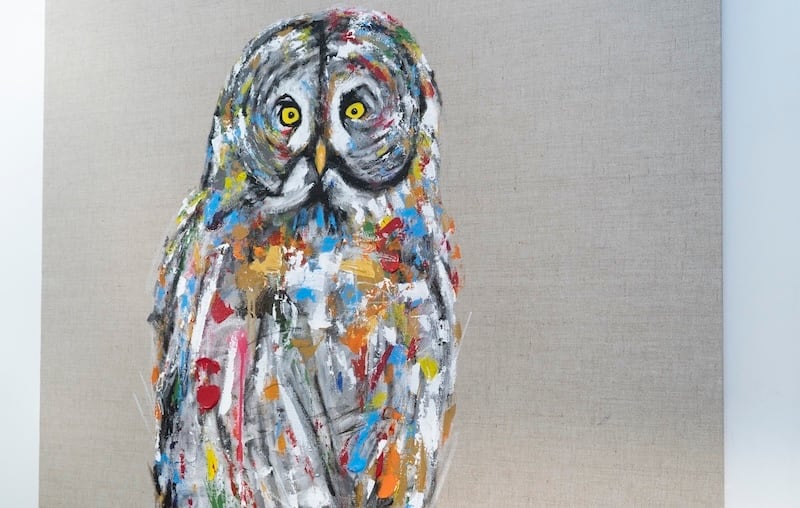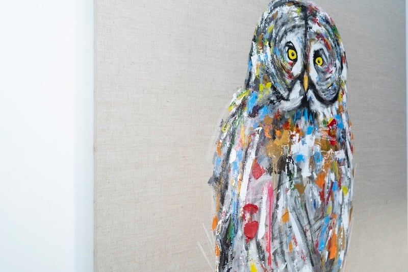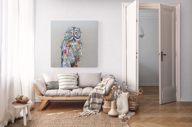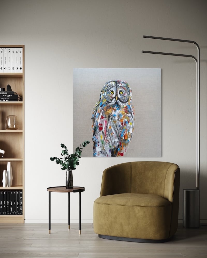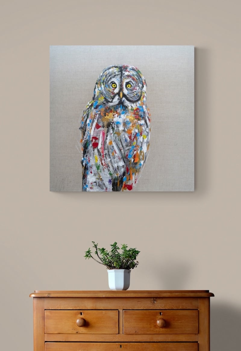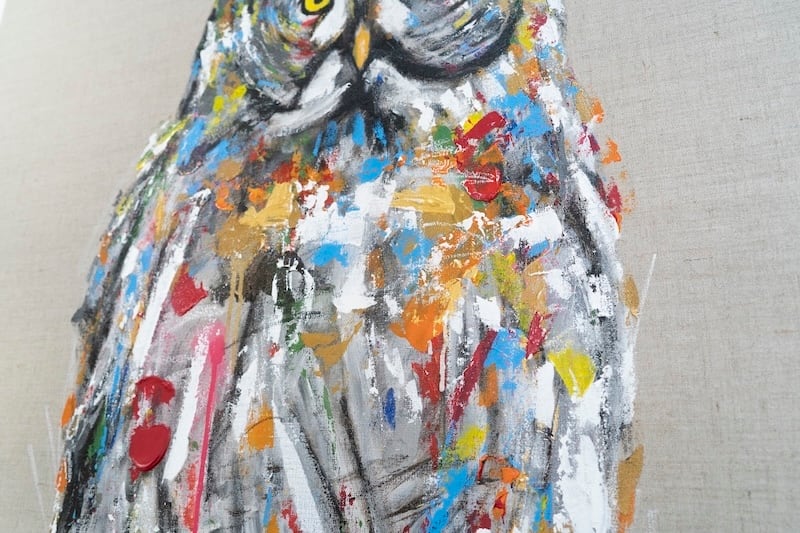 知性や幸運の象徴でもあるフクロウをキャンバスに表現した作品。キャンバスの質感をお洒落な感じに残し沢山の色を使って表現されたフクロウがかっこよくもあり、可愛らしい作品になっています。フクロウ好きには大変おすすめです。