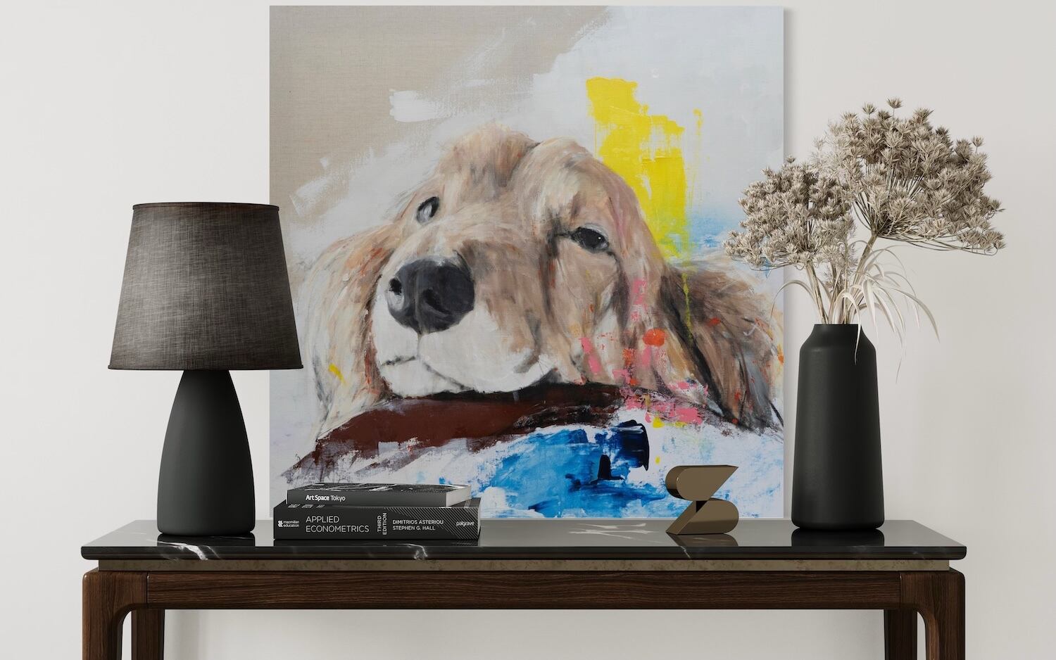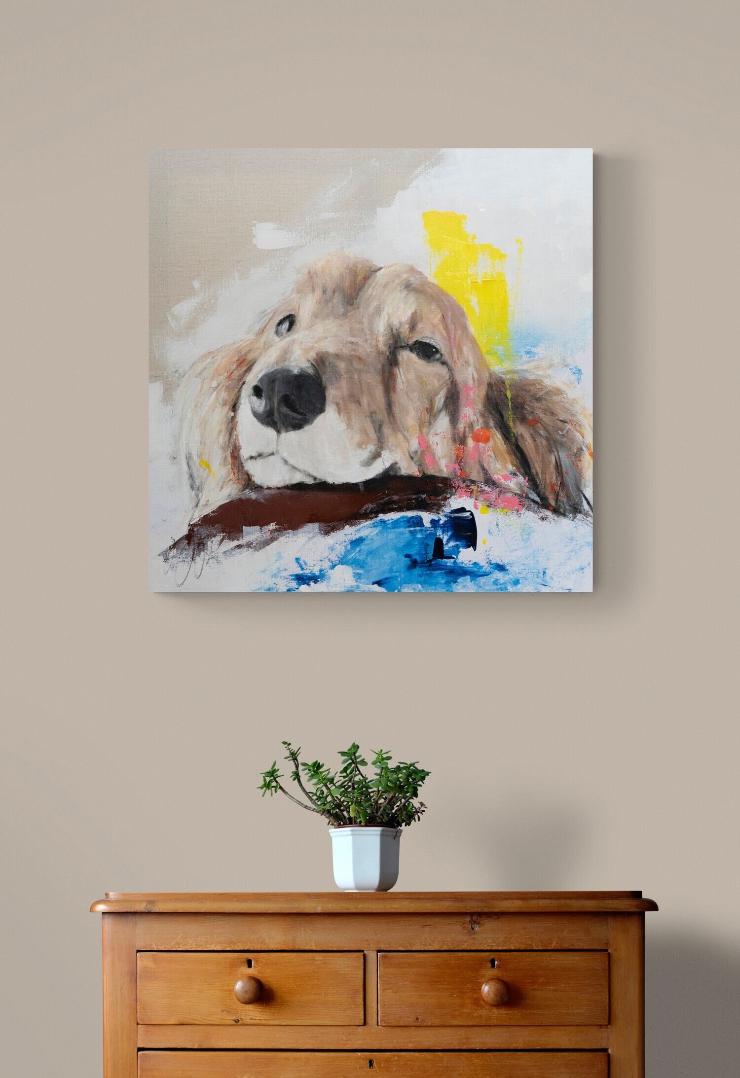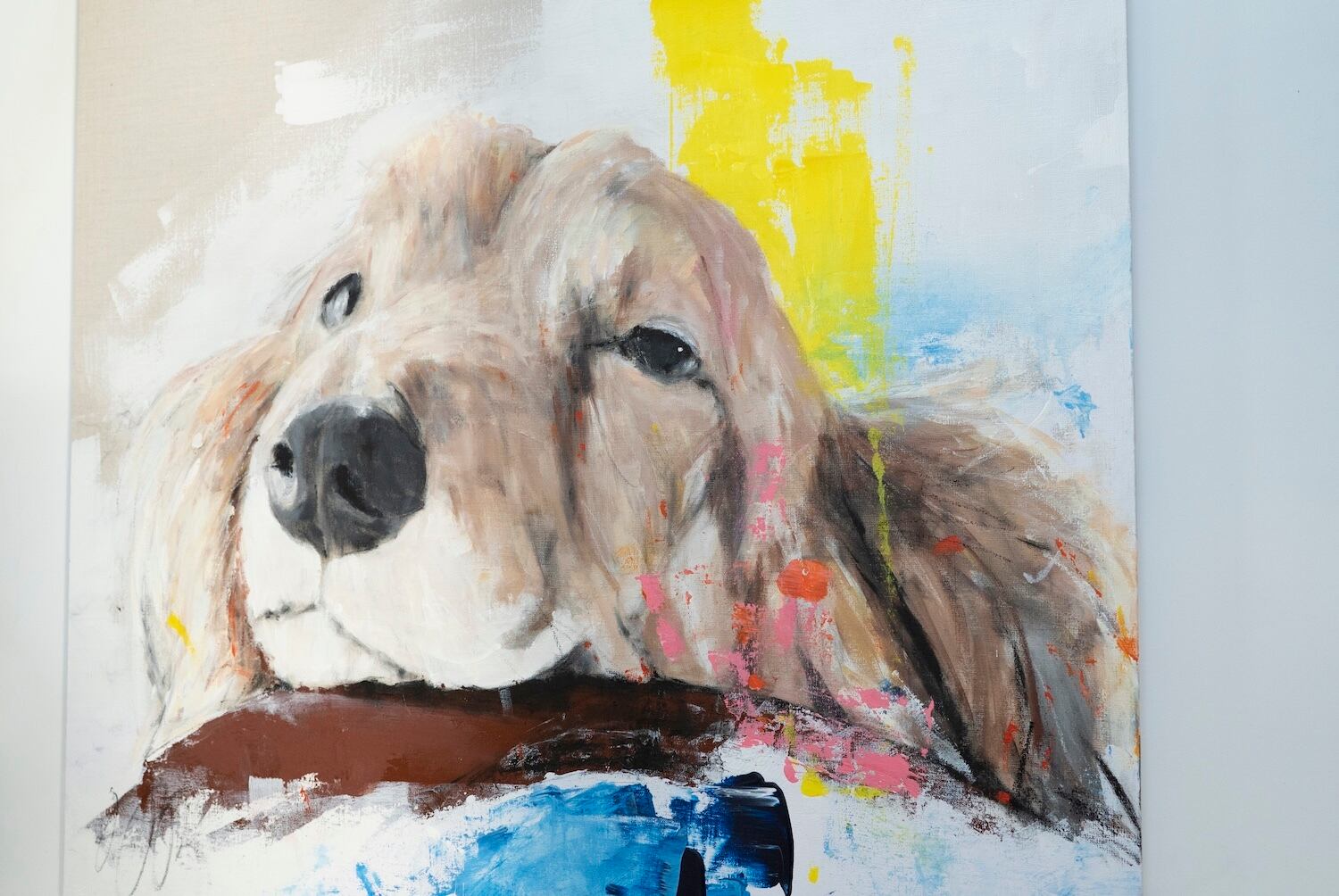 ミニチュアダックスの可愛らしい雰囲気やリラックスした表情がとても可愛らしい作品です。大きな正方形キャンバスに描かれていて迫力もあります。