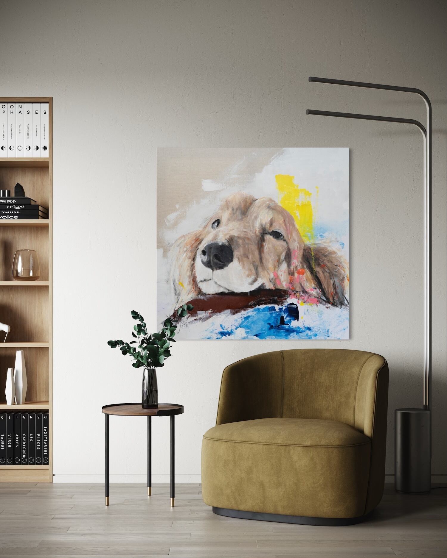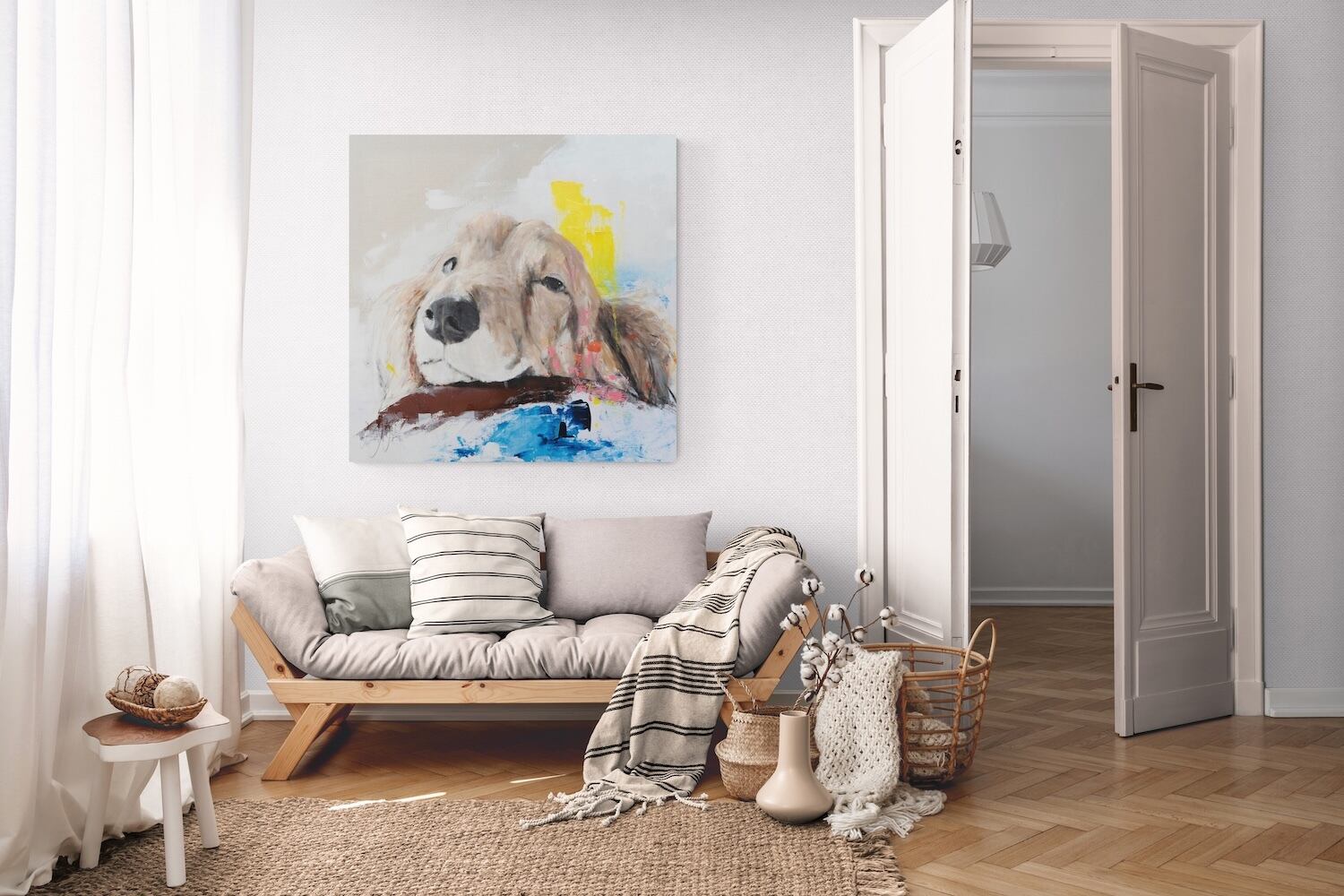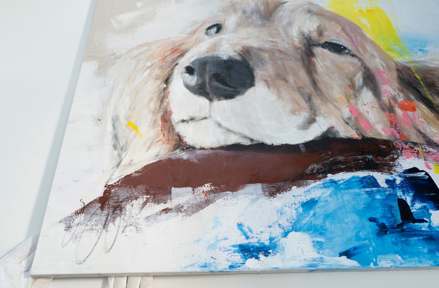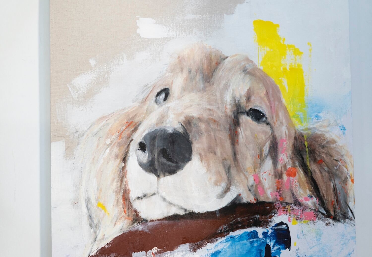 ミニチュアダックスの可愛らしい雰囲気やリラックスした表情がとても可愛らしい作品です。大きな正方形キャンバスに描かれていて迫力もあります。