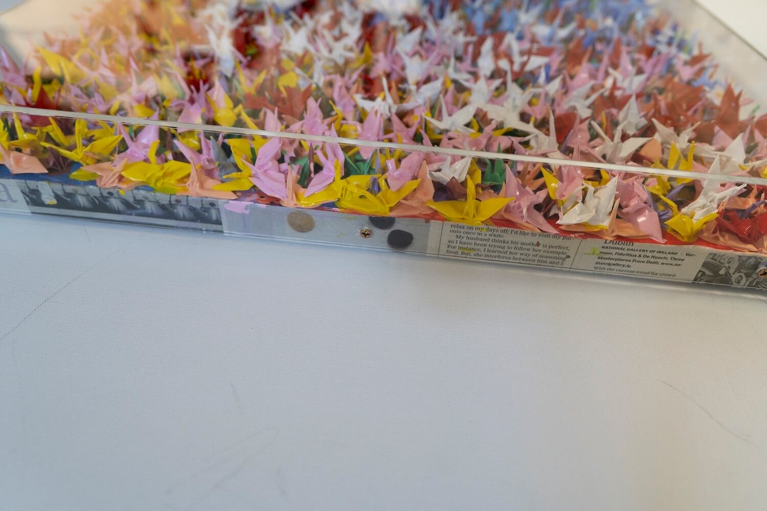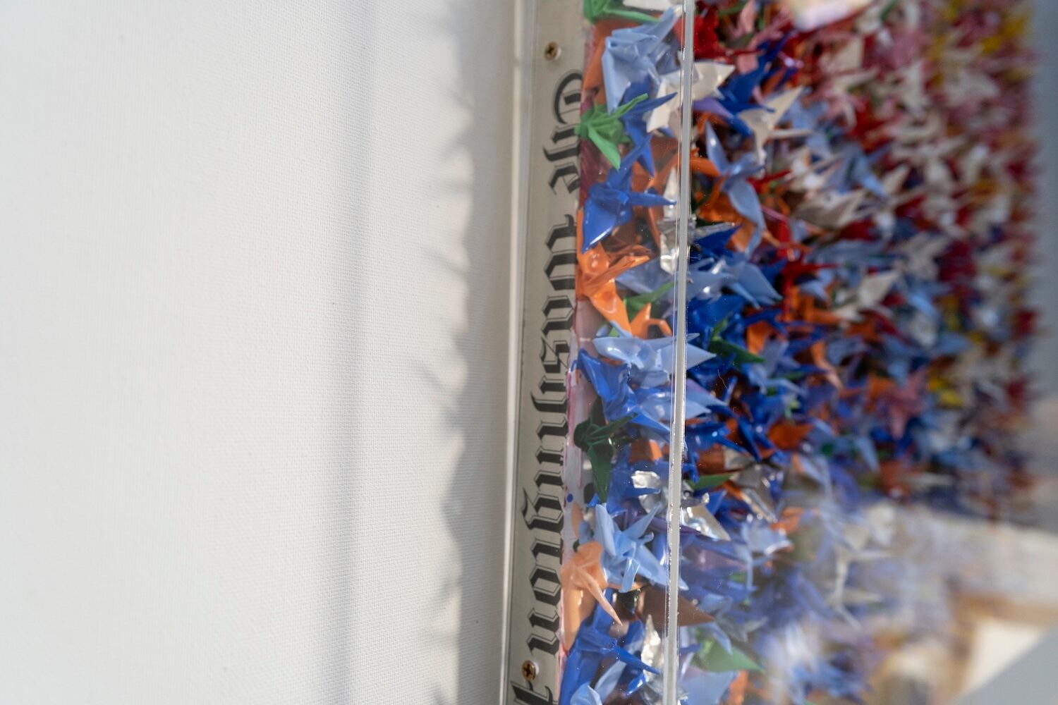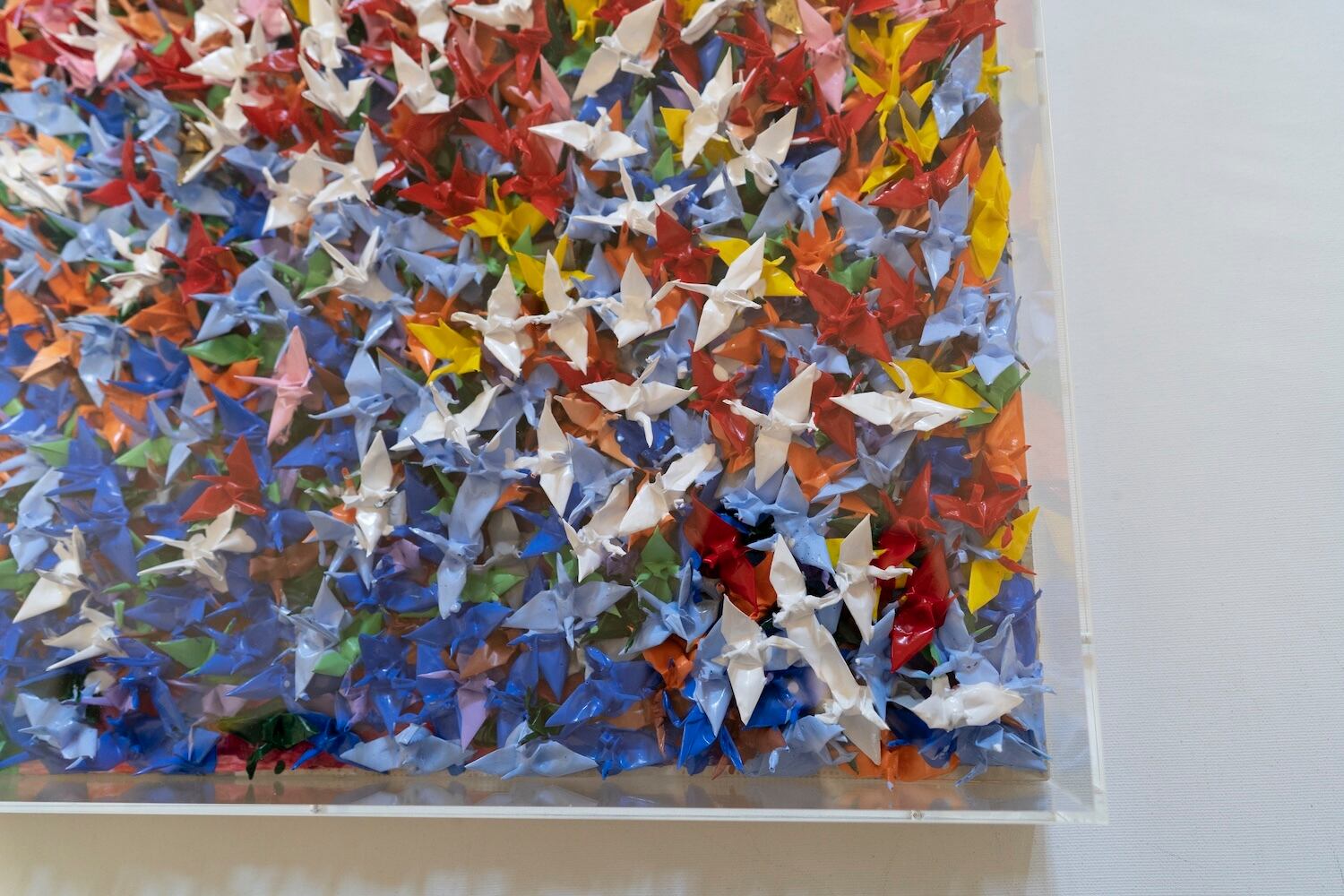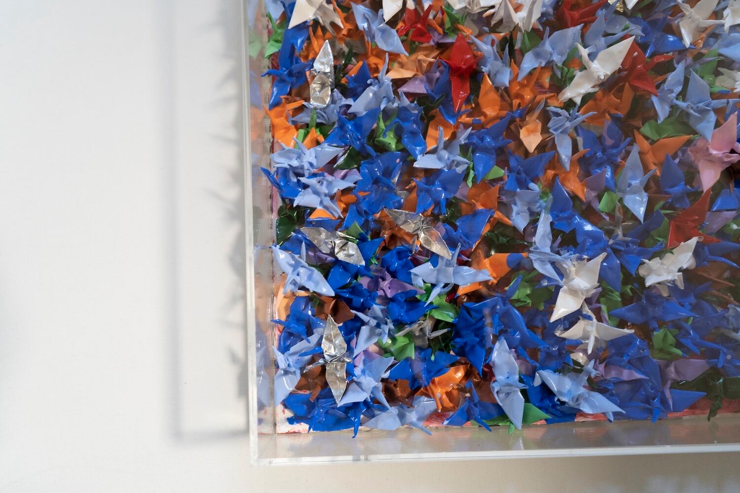 本作は千羽の鶴を取り入れウッドパネルに色鮮やかに抽象的に制作されています。千羽鶴が醸し出す独特な美しさ、雰囲気を十二分に楽しめる作品となっています。側面は英字新聞がコラージュされています。アクリルボックスに額装したポップアート作品。 こちらの作品は小さめの鶴になっており飾りやすいサイズ感になっております。