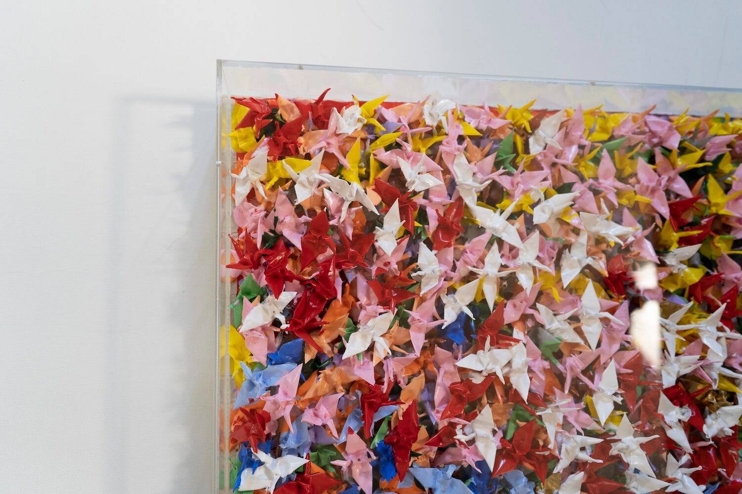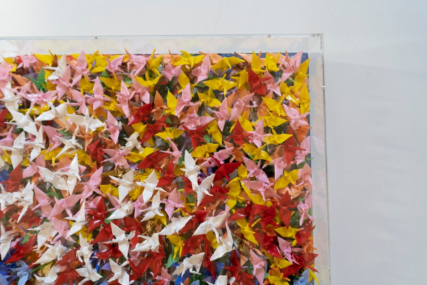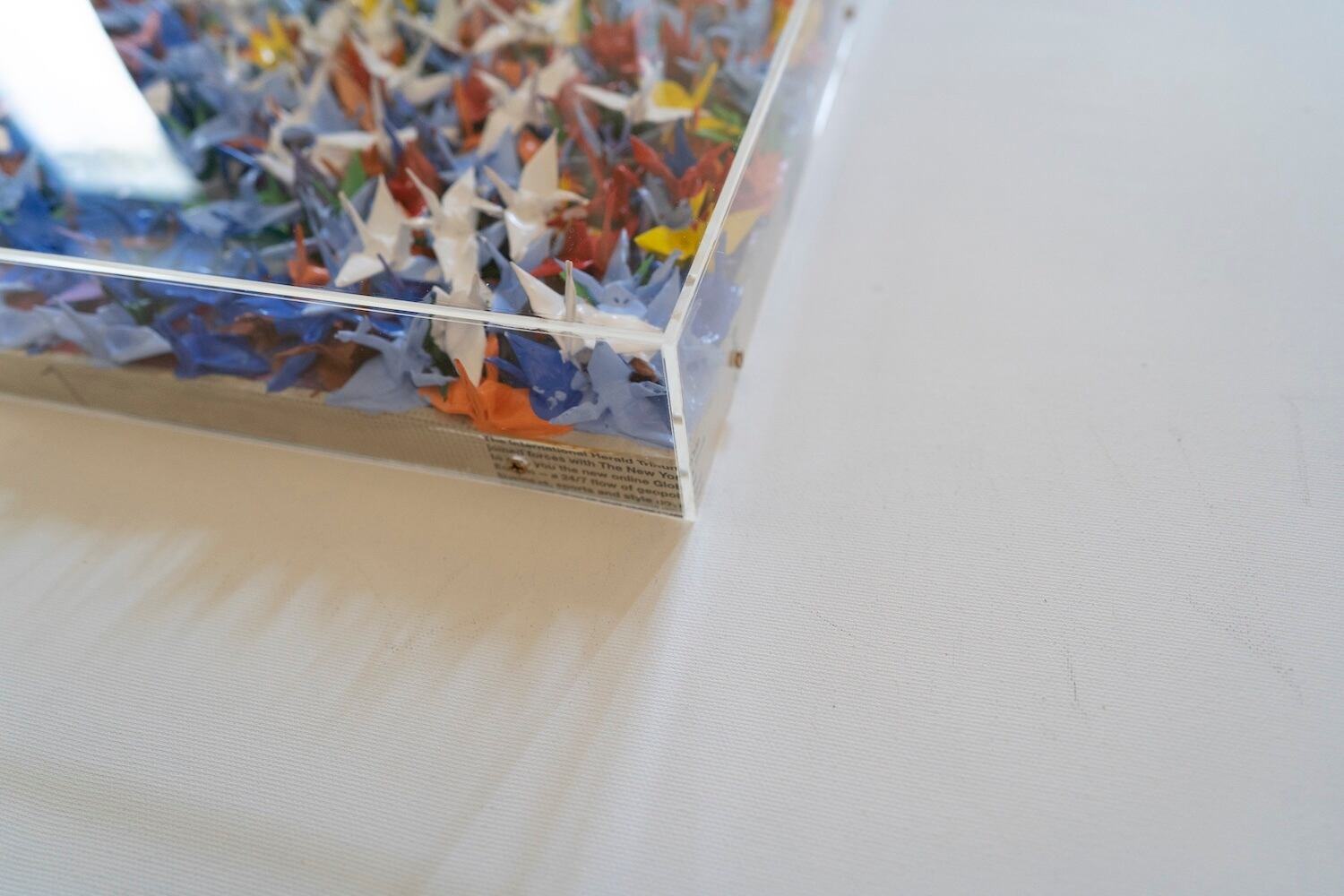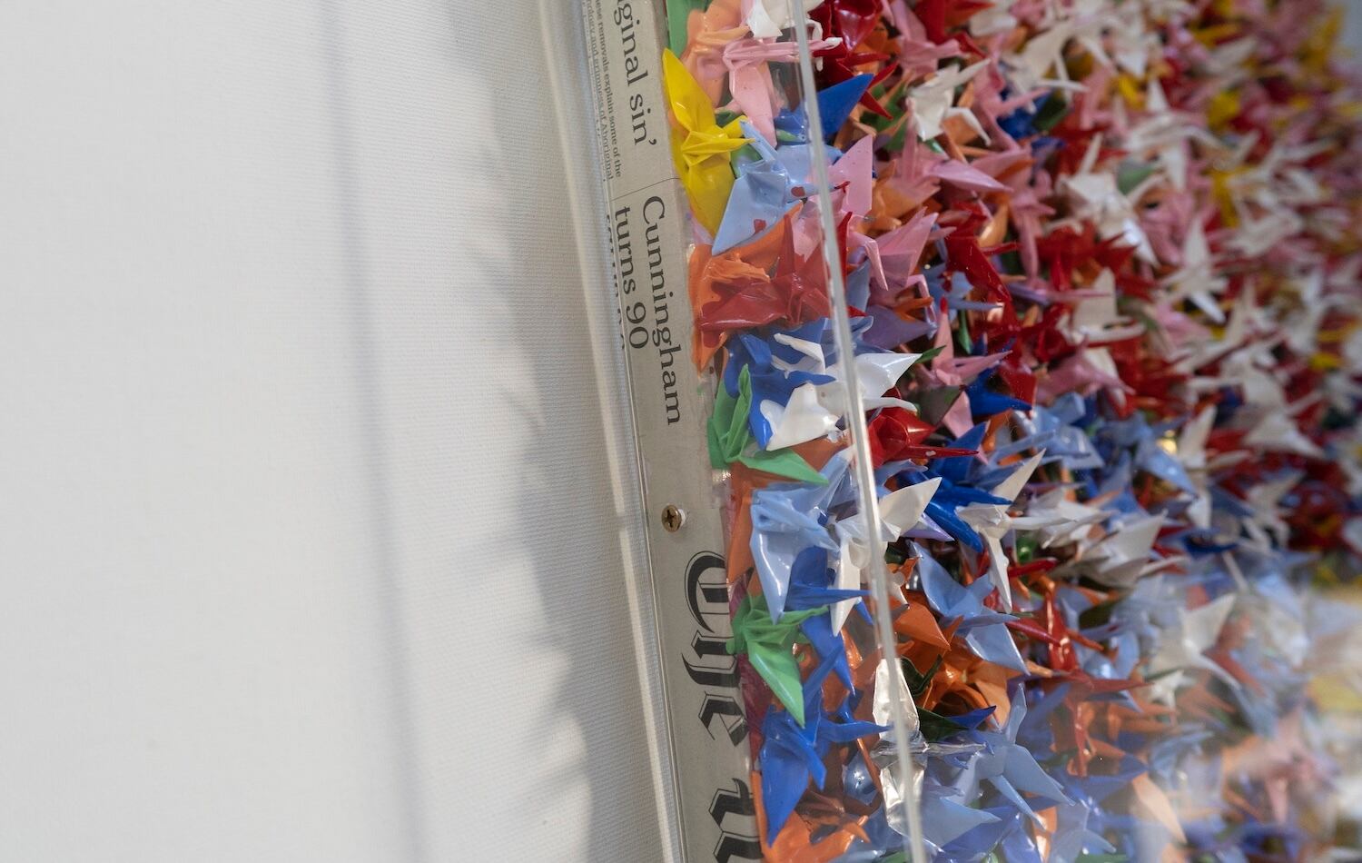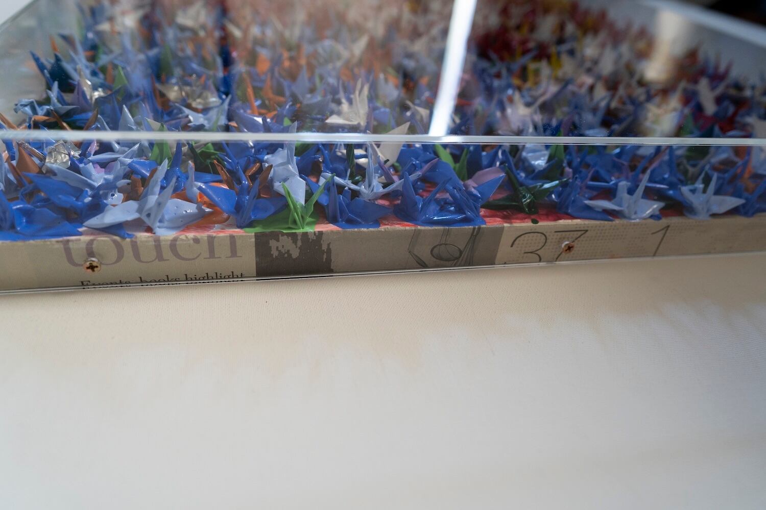 本作は千羽の鶴を取り入れウッドパネルに色鮮やかに抽象的に制作されています。千羽鶴が醸し出す独特な美しさ、雰囲気を十二分に楽しめる作品となっています。側面は英字新聞がコラージュされています。アクリルボックスに額装したポップアート作品。 こちらの作品は小さめの鶴になっており飾りやすいサイズ感になっております。