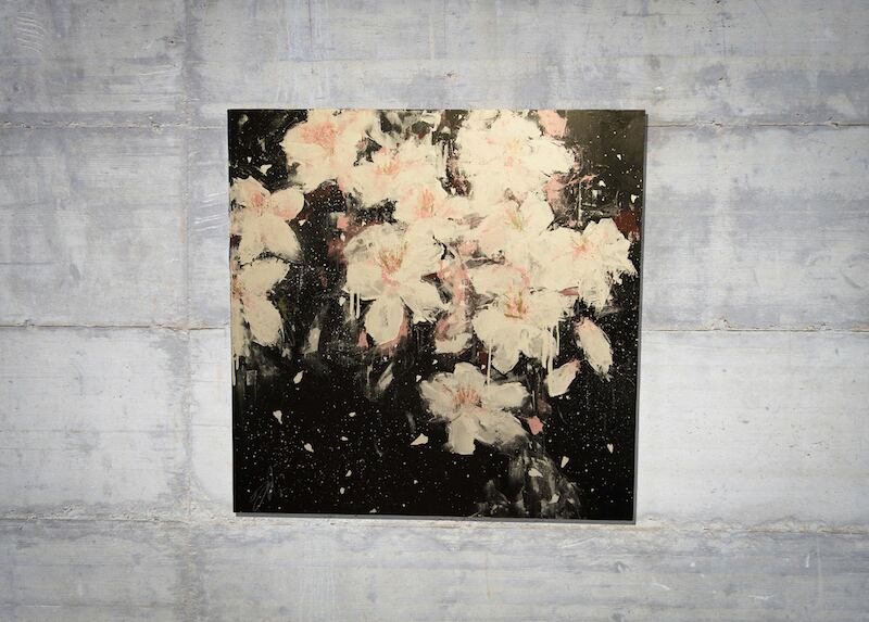 大きめ正方形キャンバスに制作された夜桜の作品。他の桜の作品と違い、寄りで画面に大きく桜の花を描いた1点。