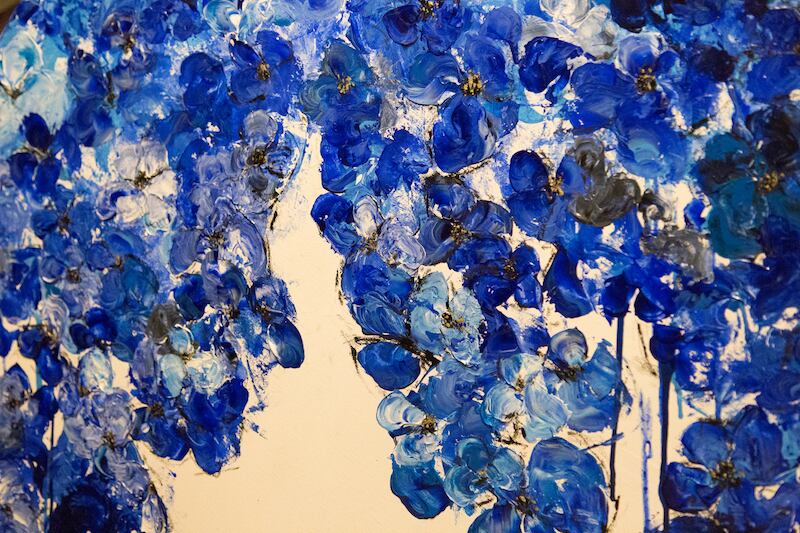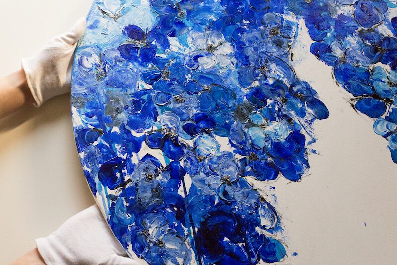 この作品用に特注した大きめ円形キャンバスに描かれた花の作品。